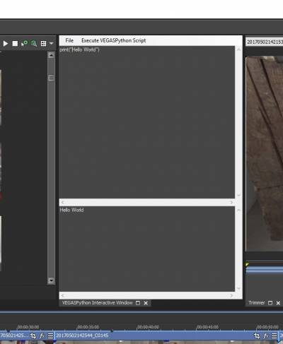 in the input textbox and click on „Execute VEGASPython Script“ in the Menu. The text „Hello World“ will be printed into the Output textbox.