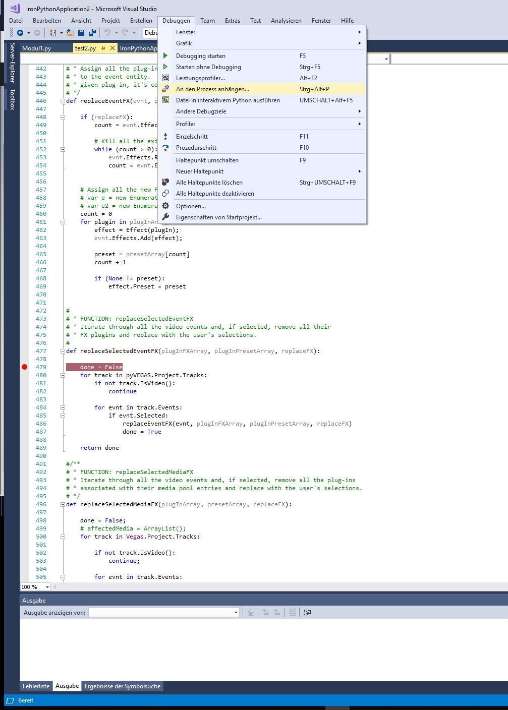 When VEGAS is started, we now have to tell Visual Studio, which program it has to monitor. We do this by opening the „Debug“-Menu and select the menu entry „Attach to process“. The following window opens: