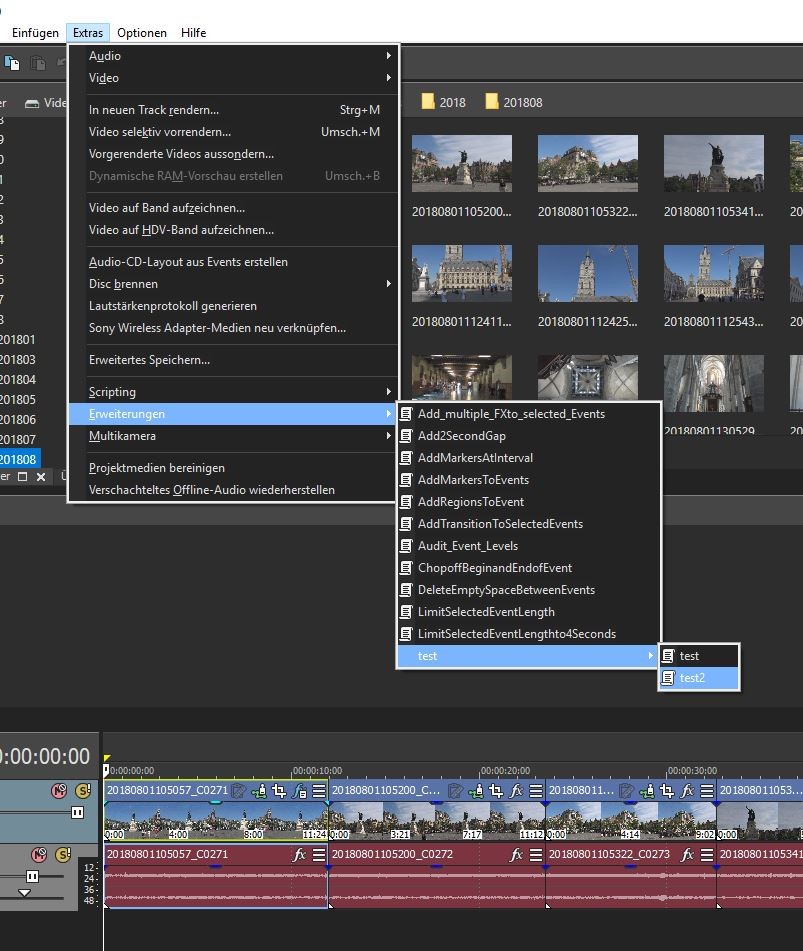 So the only step we are doing: We go to the „File“ Menu and open an existing Scripfile or create a new Scripfile. New scripts I usually place in the „Test“ subdirectory of VEGASPYTHON. So the new script shows up in Vegas in the scrit submenu „Test“.