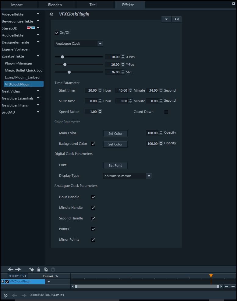 Mit dem Clockdisplay Plugin kann man eine Analoge oder Digitale Uhr in das Videobild einblenden. Dies kann z.B. für Sportvideos oder für Videos mit physikalischen Tests interessant sein.