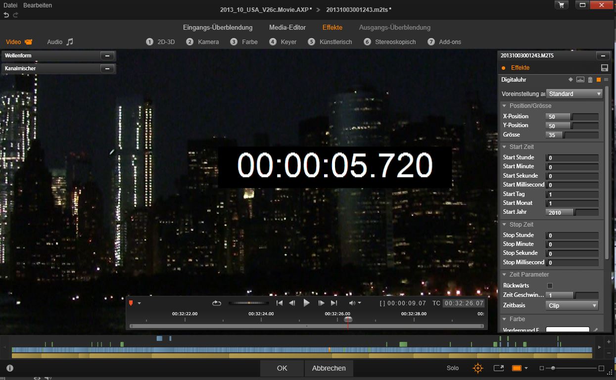 Der „Digitale Uhr“ Effekt erzeugt eine digitale Uhr auf dem Videobild. Die Uhr zeigt Datum und Uhrzeit an. Die Uhr läuft in Echtzeit, wenn der Videoclip läuft. Wie die Uhr läuft und das Aussehen kann sehr flexibel eingestellt werden: