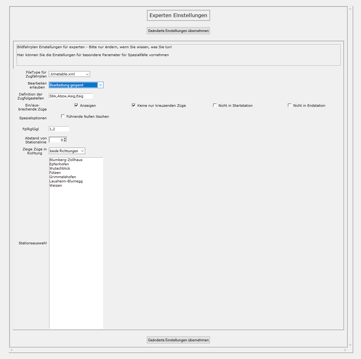 In speziellen Fällen kann es gwünscht sein ein, oder mehrere Betriebsstellen nicht anzuzeigen, um den Bildfahrplan übersichtlich zu halten. In dieser Liste können alle Betriebstellen ausgewählt werden, die angezeigt werden sollen.
