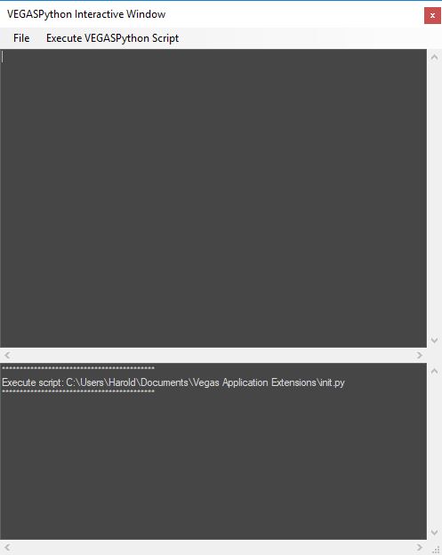 You open the window in VEGAS via „View - Extensions - VEGASPython Interactive Window“