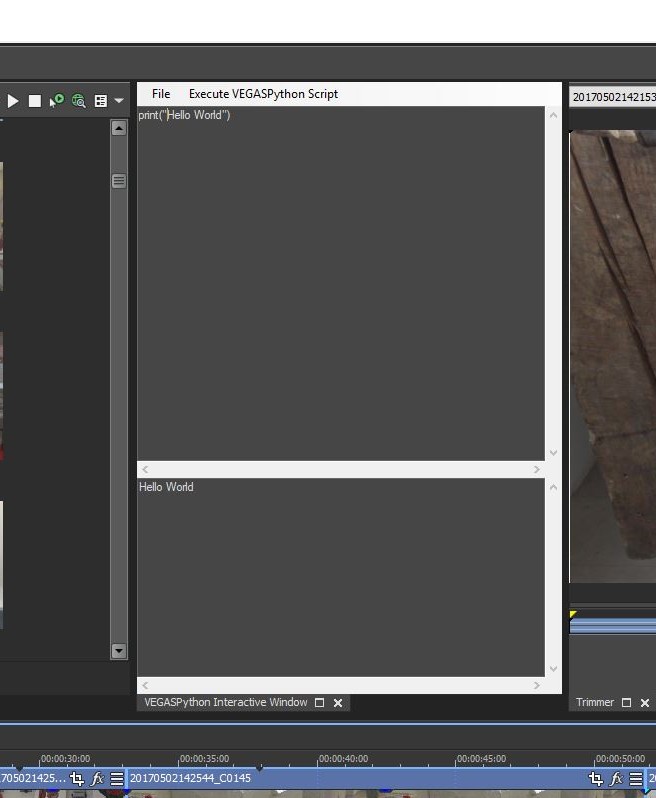 Please try other texts for printing. You will see that with every click on „Execute VEGASPythonScript“ the Output textbox is cleared and the new text is shown in the textbox.