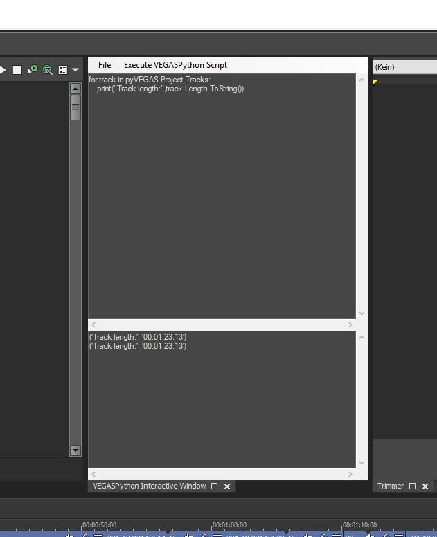Please enter it exactly as it is written here. Important are the 4 blanks in front of the print statement. This script loops over all tracks existing in the current VEGAS project and prints the length of each track.